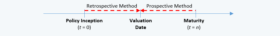 - The retrospective method is backward looking. It accumulates cash flows occur from policy inception to valuation date. Example: Asset share.