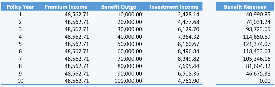 Let’s look at benefit reserves calculation for a portfolio with premium income, benefit outgo and investment income shown in the table below. Although prospective method is the most common method in determining reserves (using net level premium method), we can actually use both retrospective & prospective methods for the calculations.