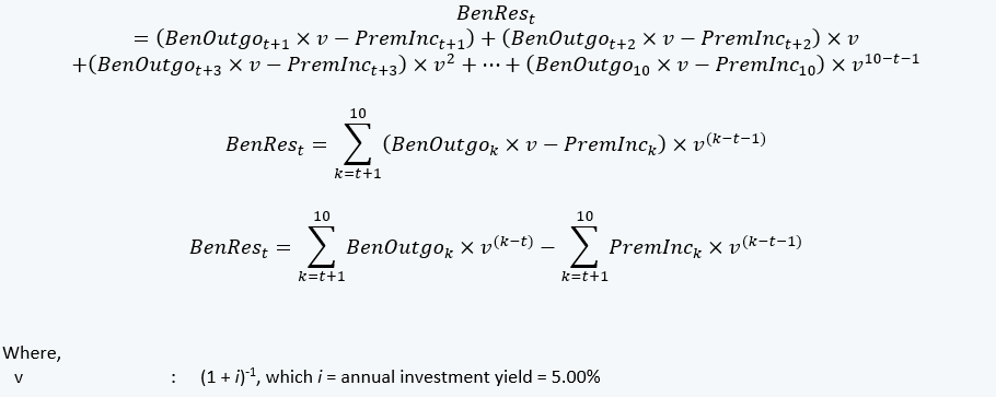 BenRest = (BenRest+1 + BenOutgot+1) × v – PremInct+1