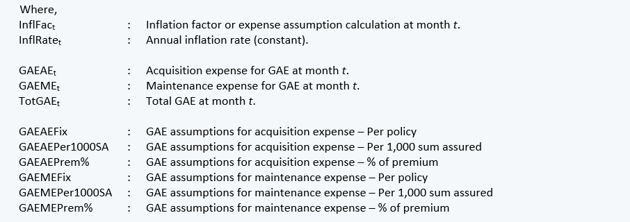To cater for Inflation effect, the “per policy” component of expense assumptions is adjusted monthly in the cash flow model. The starting point of applying inflation effect varies by company practices, e.g. starting from t = DUR_M + 2 (e.g. inflation factor for t = DUR_M + 1 is set to 1).
