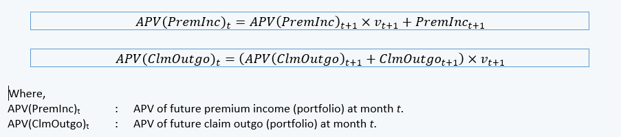 Normally APV components are calculated on portfolio basis. We may calculate APV components by using recursive method, i.e. by reusing results from the next period: